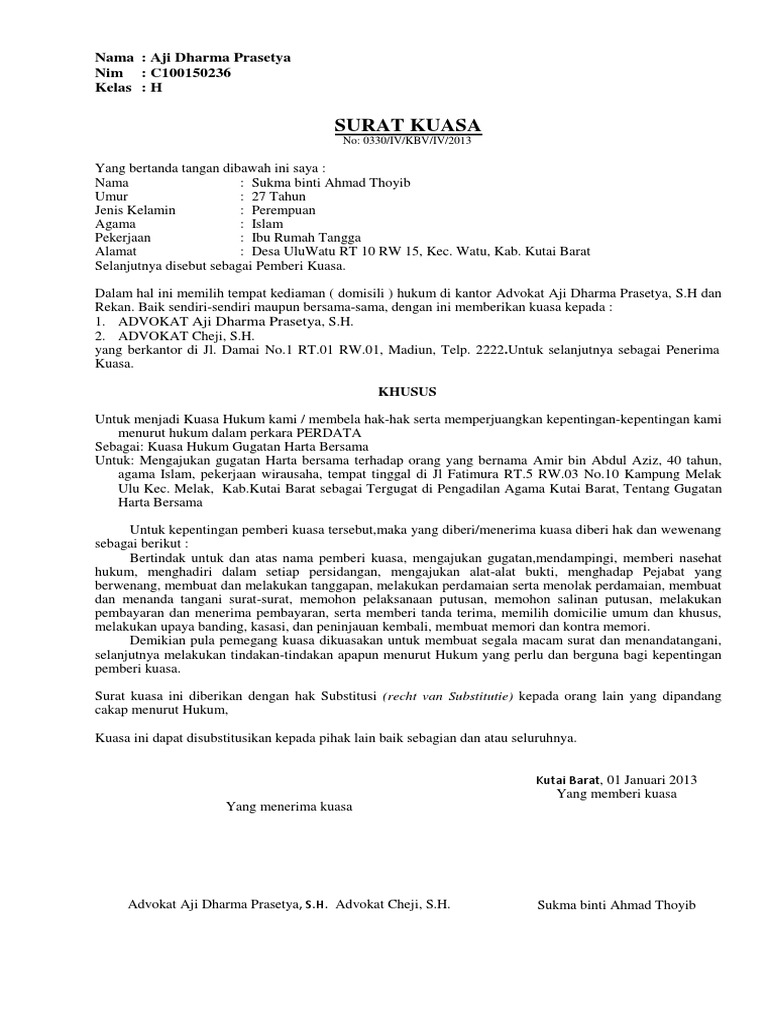 Dalam hal pelimpahan wewenang dimaksud, maka pemberi wewenang 11. Bandung deskripsi jenis harta kekayaan yang akan dikuasakan pengurusannya, yang juga ditulis secara jelas dan tegas. Contoh format pembuatan surat kuasa khusus. Surat kuasa umum adalah surat kuasa dari seseorang kepada seseorang yang lainnya untuk mengurus beberapa urusan peribadi pemberi kuasa. Pembagian harta gono gini diatur dimana harta dibagi rata dari keseluruhan harta gono gini yang diperoleh;